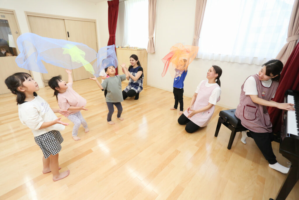 週1回程度 リトミックの専門講師と一緒に考えたオリジナルプログラムを行っています。音楽に合わせて子どもも先生も楽しく活動をしています♬